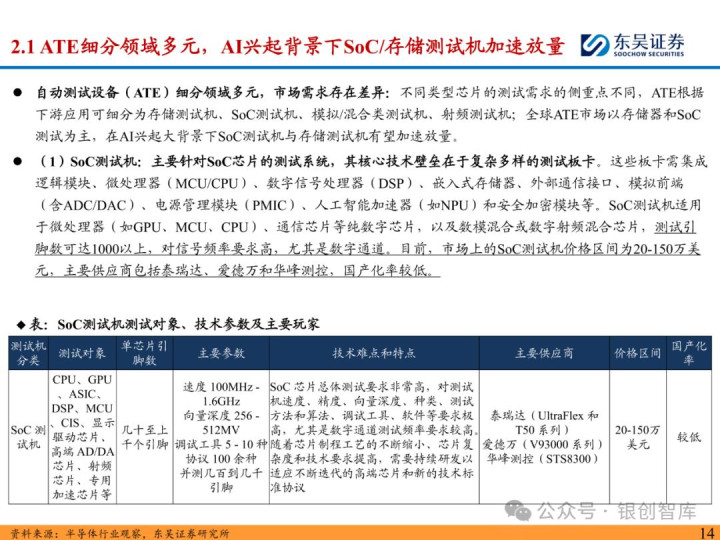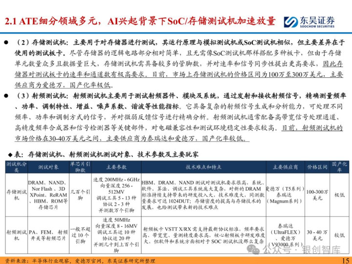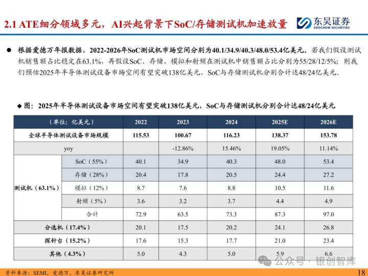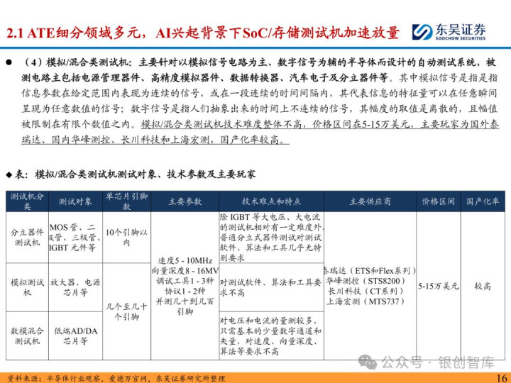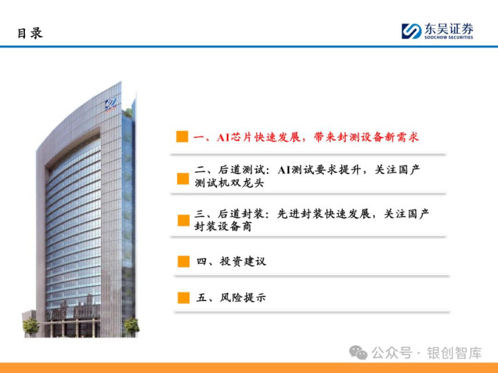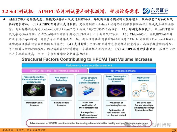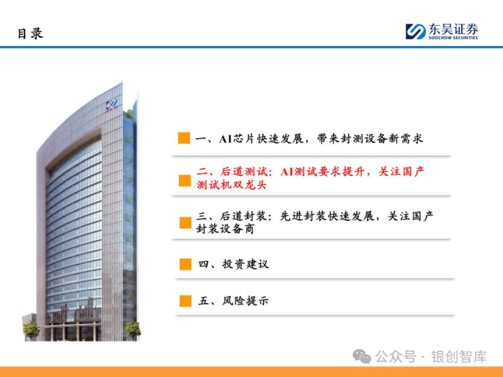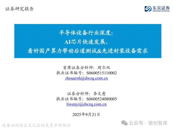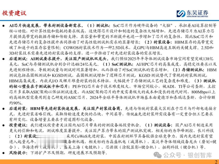 随着 ChatGPT 等生成式 AI 技术加速产业化,中国智能算力与 AI 芯片市场规模持续扩张,2024 年智能算力达 640.7EFLOPS、AI 芯片市场突破 1405.9 亿元。AI 芯片对性能与集成度的高要求,正重塑半导体封测设备行业格局:一方面,SoC 芯片(端侧 AI 核心)与 HBM 等先进存储复杂性提升,推动高性能测试机需求激增,预计 2025 年全球半导体测试设备市场突破 138 亿美元,虽爱德万、泰瑞达仍垄断超 90% 市场,但华峰测控、长川科技等国内企业已实现技术突破;另一方面,HBM 与 CoWoS 封装成主流方案,带动减薄机、键合机等先进封装设备需求,国内封测环节具备全球竞争力,晶盛机电、拓荆科技等标的加速国产替代。本报告聚焦 AI 驱动下封测设备新需求、技术壁垒与竞争格局,梳理投资机会并提示相关风险,为行业研究与投资决策提供参考。
