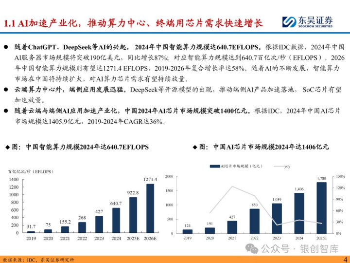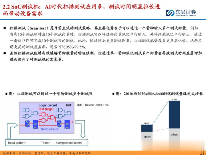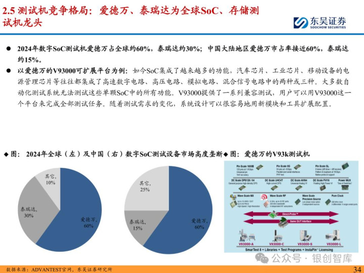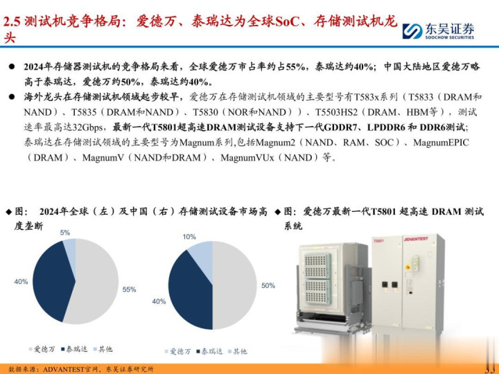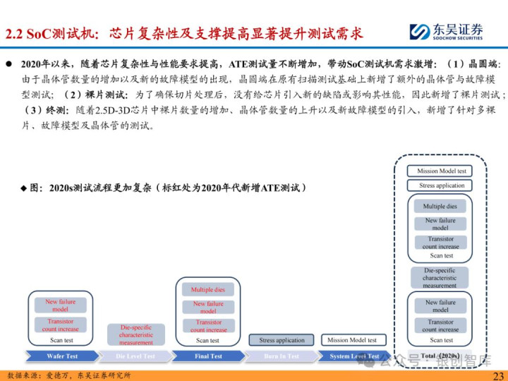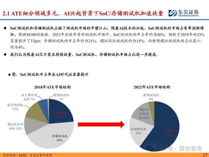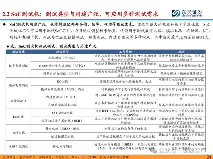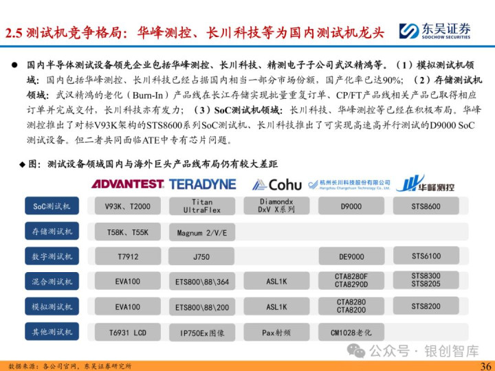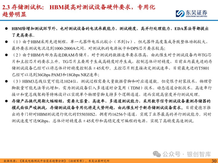 随着 ChatGPT 等生成式 AI 技术加速产业化,中国智能算力与 AI 芯片市场规模持续扩张,2024 年智能算力达 640.7EFLOPS、AI 芯片市场突破 1405.9 亿元。AI 芯片对性能与集成度的高要求,正重塑半导体封测设备行业格局:一方面,SoC 芯片(端侧 AI 核心)与 HBM 等先进存储复杂性提升,推动高性能测试机需求激增,预计 2025 年全球半导体测试设备市场突破 138 亿美元,虽爱德万、泰瑞达仍垄断超 90% 市场,但华峰测控、长川科技等国内企业已实现技术突破;另一方面,HBM 与 CoWoS 封装成主流方案,带动减薄机、键合机等先进封装设备需求,国内封测环节具备全球竞争力,晶盛机电、拓荆科技等标的加速国产替代。本报告聚焦 AI 驱动下封测设备新需求、技术壁垒与竞争格局,梳理投资机会并提示相关风险,为行业研究与投资决策提供参考。
